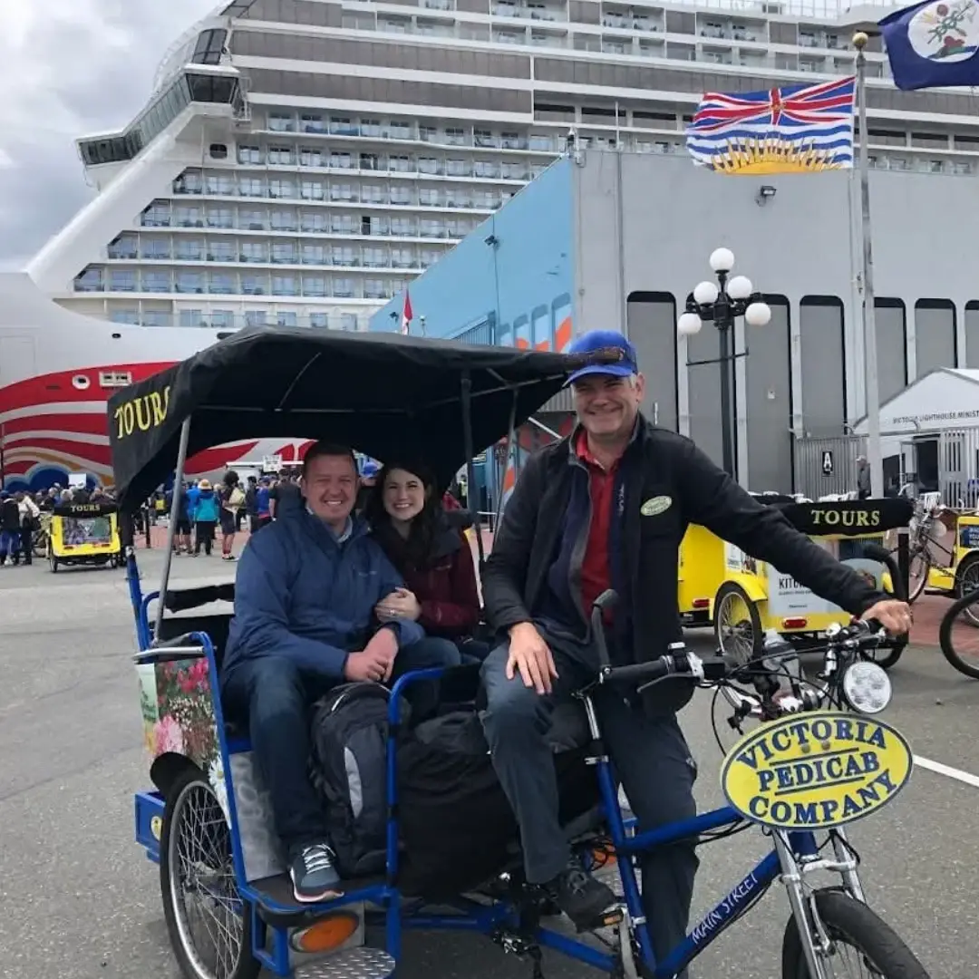 The tour starts and ends at the Victoria Cruise Ship Terminal. Once you exit the buildings we will be on your left, look for the Pedicab signs.